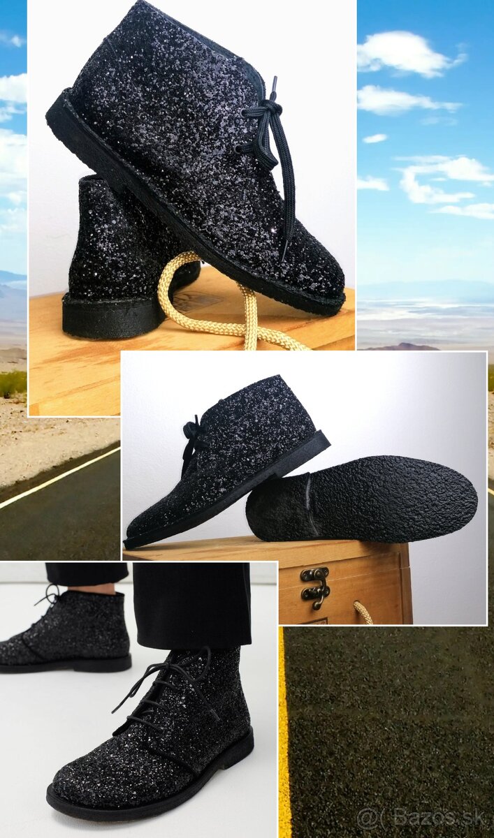 Topánočky sú kožené s povrchovou úpravou. Sú potiahnuté do trblietavých drobných antracitovo - čiernych kryštálikom. preto sa lesknú.