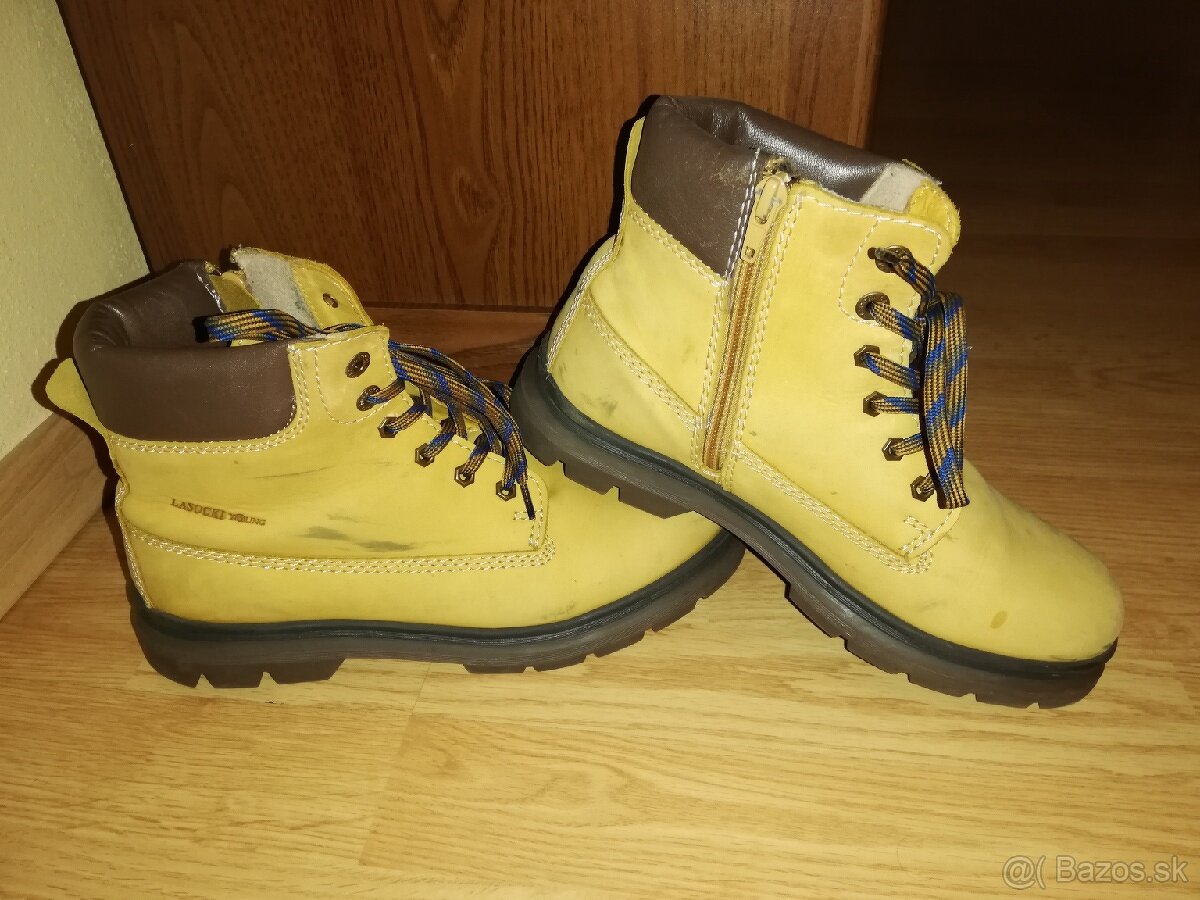 Zimné topánky horčicovej farby su vo veľkosti 39. Majú zips aj šnúrky. Okrem šmúh nemajú žiadne iné poškodenia.