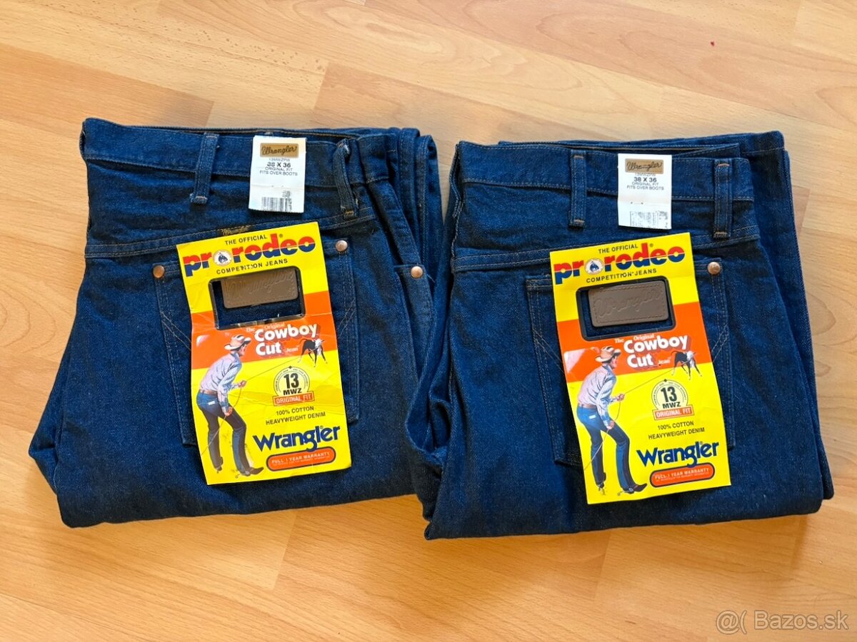 Predam originalne, uplne nove, nenosene rifle Wrangler Jeans model 13MWZ, velkost 38x36, 100% cotton heavyweight denim, original fit, cowboy cut - fits over boots, The Official Pro Rodeo Competition Jeans. Dovoz priamo z U.S.A.