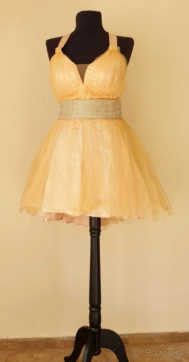 Spoločenské šaty - [29.11. 2025]Krásne dlhé princeznovské spoločenské šaty zlatej farby vo veľkosti 36. Skladajú sa z korzetu so šnurovaním a viacvrstvovej sukne.