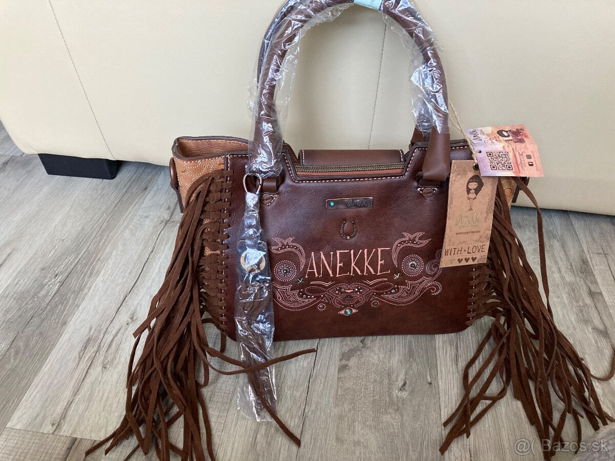 Anekke kabelka z kolekcie Arizona, po bočných stranách má strapce. Kabelka obsahuje 3 samostatné priečinky, 2 sú uzatvárateľné na magnet a 1 na zips - viď fotky. Praktické spracovanie, súčasťou je odnímateľný dlhý popruh aj prívesok. Balené v taške Anekke, bežne už nezohnateľný kúsok.
