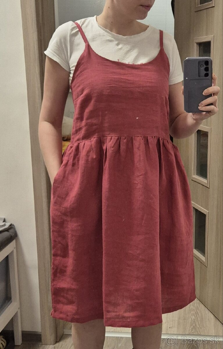 Posuniem ľanové šaty Elena od Simply Gray vo farbe raspberry. Veľkosť XS, dĺžka skrátená (na ziadost skratene vyrobcom) na 91cm (pôvodne 95cm). Odopinacie nastaviteľné ramienka na 3 gombíky. Dajú sa zapnúť aj do kríža.