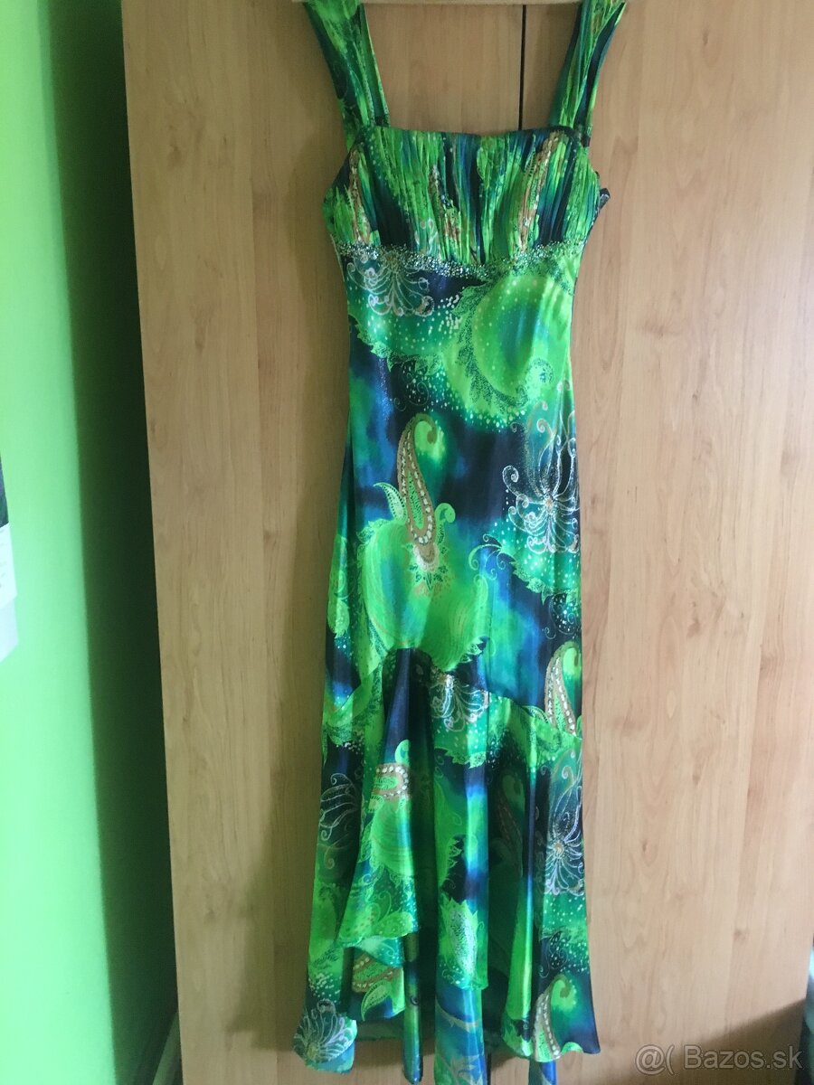 Predám dlhé spoločenské šaty zeleno-modrej farby. Šaty sú na ramienka, vpredu na prsiach sú drobné kamienky. Šaty sú dole zostrihané asymtericky, vpredu sú kratšie a vzadu dlhé po zem. Veľkosť šiat je 40/L, sú nekrčivé a veľmi pekne sedia na postave. Šaty sú veľmi pestré a určite si ich každý na vás všimne. Cena šiat je 5€ + poštovné. Tel. č. vymyslené, písať e-mail.
