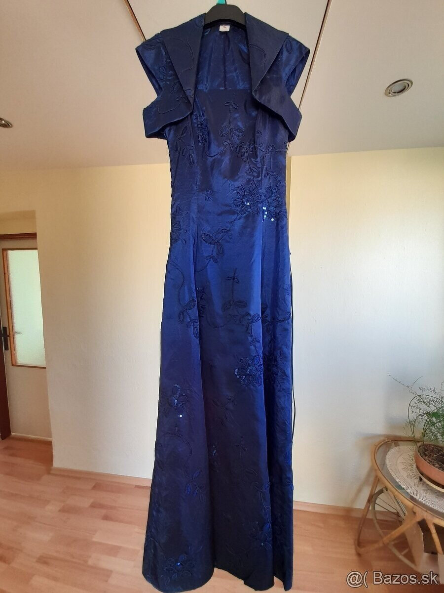 Predám krásne spoločenské šaty tmavomodrej farby, veľkosť 38. Šaty sú dlhé, majú širšie ramienka a je k nim aj bolérko. Na bokoch majú šnurovačky, čím sa dajú prispôsobiť postave. Boli 1x oblečené. Cena 50€ + poštovné. V skutočnosti sú oveľa krajšie ako na vešiaku.