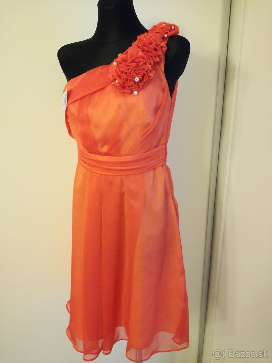 Oranžové šaty na 1 rameno + prídavné tenké ramienko, veľ. 40, zapínanie na zips na ľavom boku, podšité, sukňová časť rozšírená, materiál ľahký padavý - polyester, pás 75 cm, dĺžka po kolená, cca 98 cm. Pôvodná cena 45 Eur.