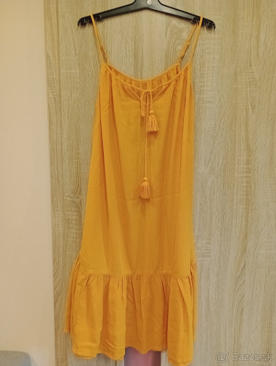 Veľkosť L/XL, vhodné aj pre tehuľky. Horčicová farba, na opálenom tele len tak žiaria 🙂