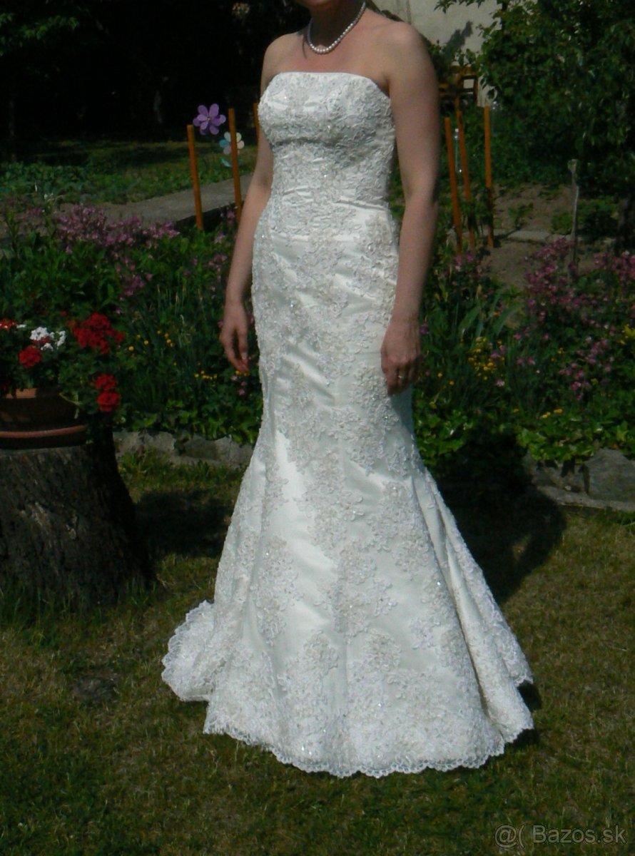 Predám pekné svadobné šaty č.38 smotanovej farby, aj topánky č.38. Šaty sú s vlečkou, ktorá sa dá vypnúť o zadnú časť šiat - tak aby sa v šatách dalo pohodlne chodiť (vlečka je nedeliteľnou súčasťou šiat, takže keď sa vlečka odopne od zadnej časti šiat tak plní funkciu vlečky, teda sa "vlečie" po podlahe. Šaty sú vzadu na šnúrovanie, tak sa dajú prispôsobiť rôznym postavám a pekne formujú postavu. Najvhodnejšie sú na výšku cca 165 cm až 175 cm.