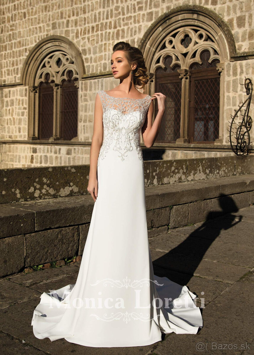 elegantná A-línia. Úzky strih, ktorý sofistikovane sedí. Iluzórny chrbát s krásnou ručnou výšivkou. Svetlá slonovinová farba. Jemné známky použitia len pri detailnom skúmaní. S vešiakom, v obale. Veľkosť 40. Bratislava, Belehradská 3