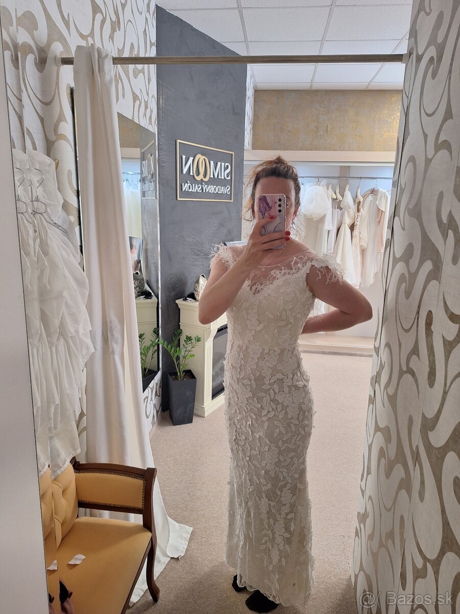 Šaty boli zúžené na 36-38. Treba sa riadiť mierami.obvod hrude -84cm, dľžka šiat -159cm. Majú v sebe ešte materiál na rozšírenie. 1krat použité bez poškodemia.Môžete ich využiť aj ako jednoduché svadobné alebo popolnočné šaty.