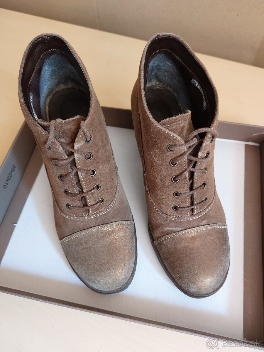 Predám kožené členkové topánky značky Tamaris. Na špičke majú zlatistý odtieň. Pohodlné na chodenie. Veľkosť 36. Výška opätku 7,5 cm. Pôvodná cena 69 €. Nosené krátko.