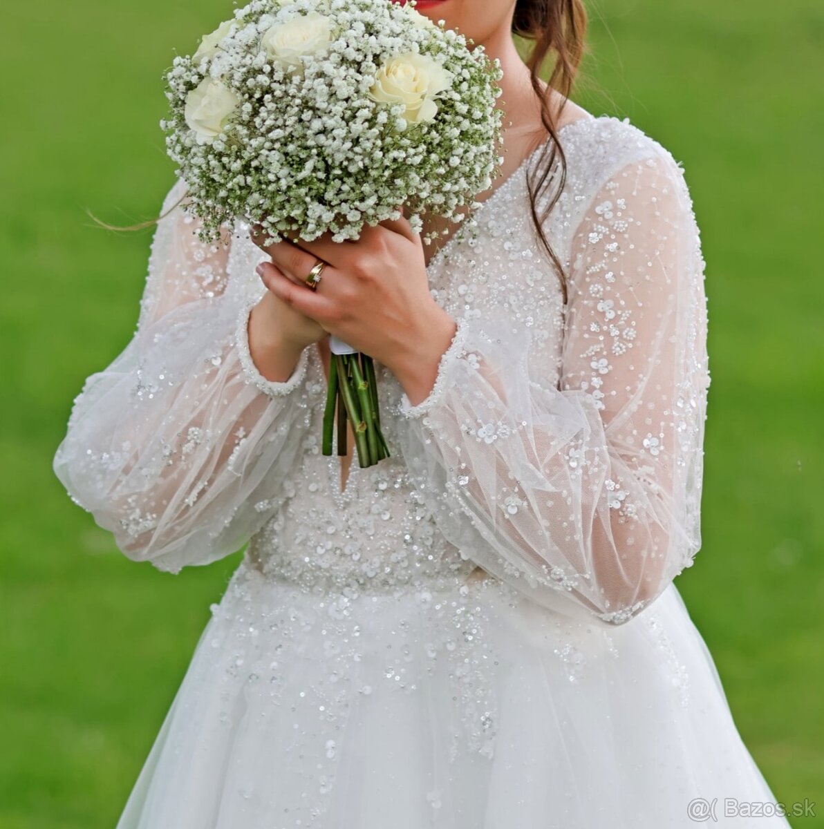 Svadobné šaty - [27.12. 2025]Predám nádherné vyšívané šaty slonovinovo-bielej farby - biela ivory. Veľkosť 36-38 (šnurovačka). Raz nosené, vyčistené. Na fokách sú nosené s požičaným kruhom. Dĺžka šiat je pôvodná, nosené boli s opätkami, výška nevesty bola 175cm, takže sa môžu dať skrátiť podľa potreby. Možnosť vyskúšania, lokal ...