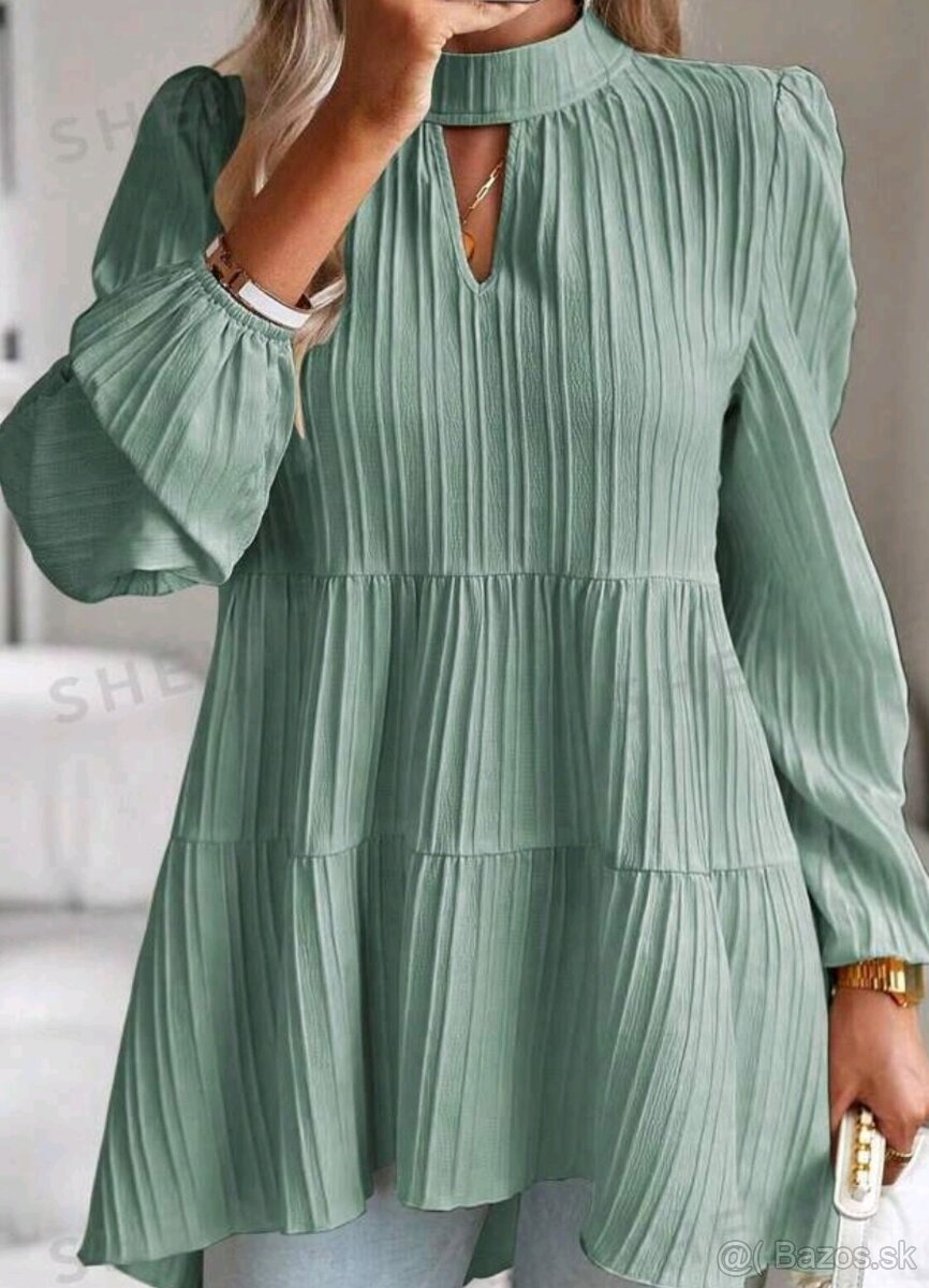 Krásna nová blúzka zelenej farby č 42. Výborný stav,nenosený, žiadné poškodenia nemá. Dôvodom predaja je že mne sú úzke na ramenách. Vpredu kratší a vzadu dlhši strih. Cena 8€ plus poštovné Na dobierku neposielam.