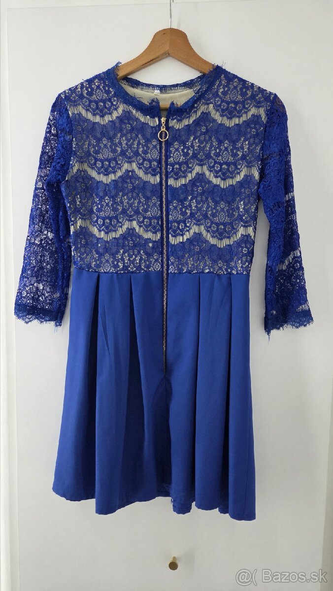 Posuniem krásne modre saty , majú zlaté tetaili, čipkovaný rukáv . V páse suknicka je nazberkana krasne ukážu na postave. Vzdušný materiál, vhodne aj na spoločenské udalosti. Dĺžka suat je 84 cm . Posuniem aj na dobierku