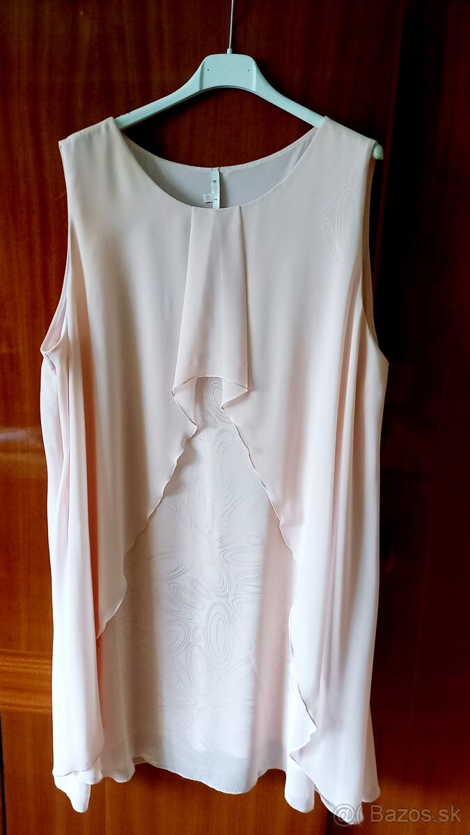 Predám krátke padavé spoločenské šaty v top stave. Šaty pekne sedia na plnšej postave a zakrývajú všetky nedostatky. Sú marhuľovej farby a v strede majú zlaté aplikácie. Veľkosť 48 (rozmery na fotkách). Materiál polyester s elastanom, takže sa prispôsobia postave.
