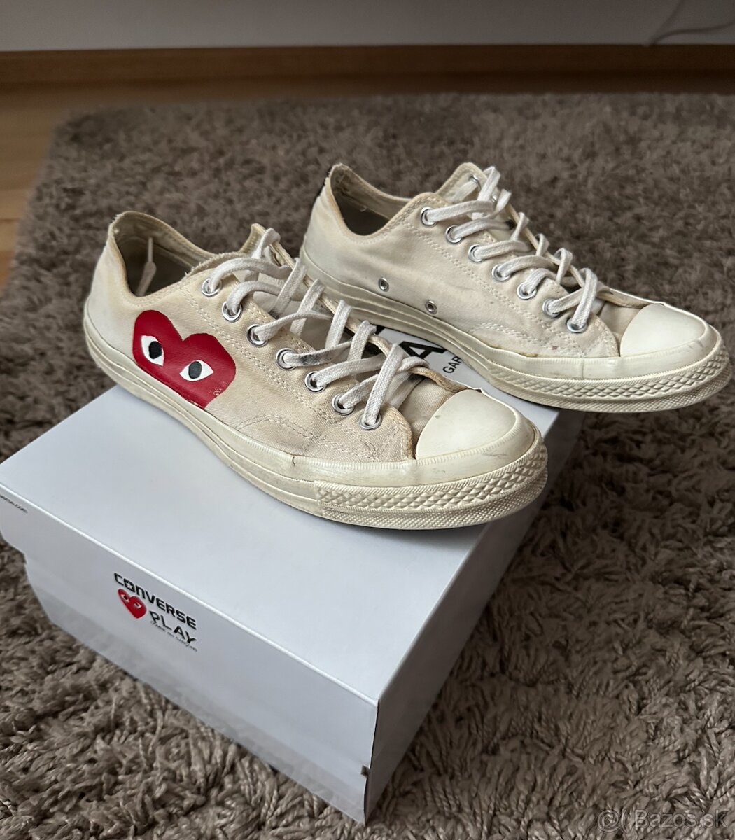 Ponukam na predaj CDG Converse play UK 9, nosene, stav vid foto, povodna cena 150, posuniem za 75. Piste mail, cislo je vymyslene. Poslem aj na dobierku, postovne v cene nie je.