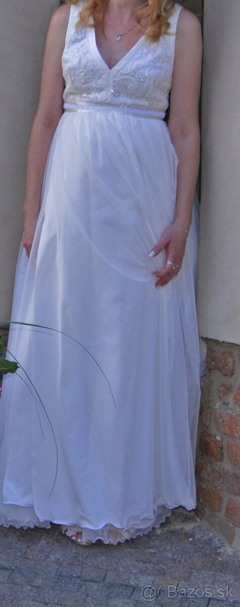 Spoločenské, svadobné šaty, tehotenské - [14.12. 2025]Predám biele čipkované spoločenské (alebo aj svadobné) tehotenské šaty s červenou saténovou stužkou do pása. Veľkosť 36