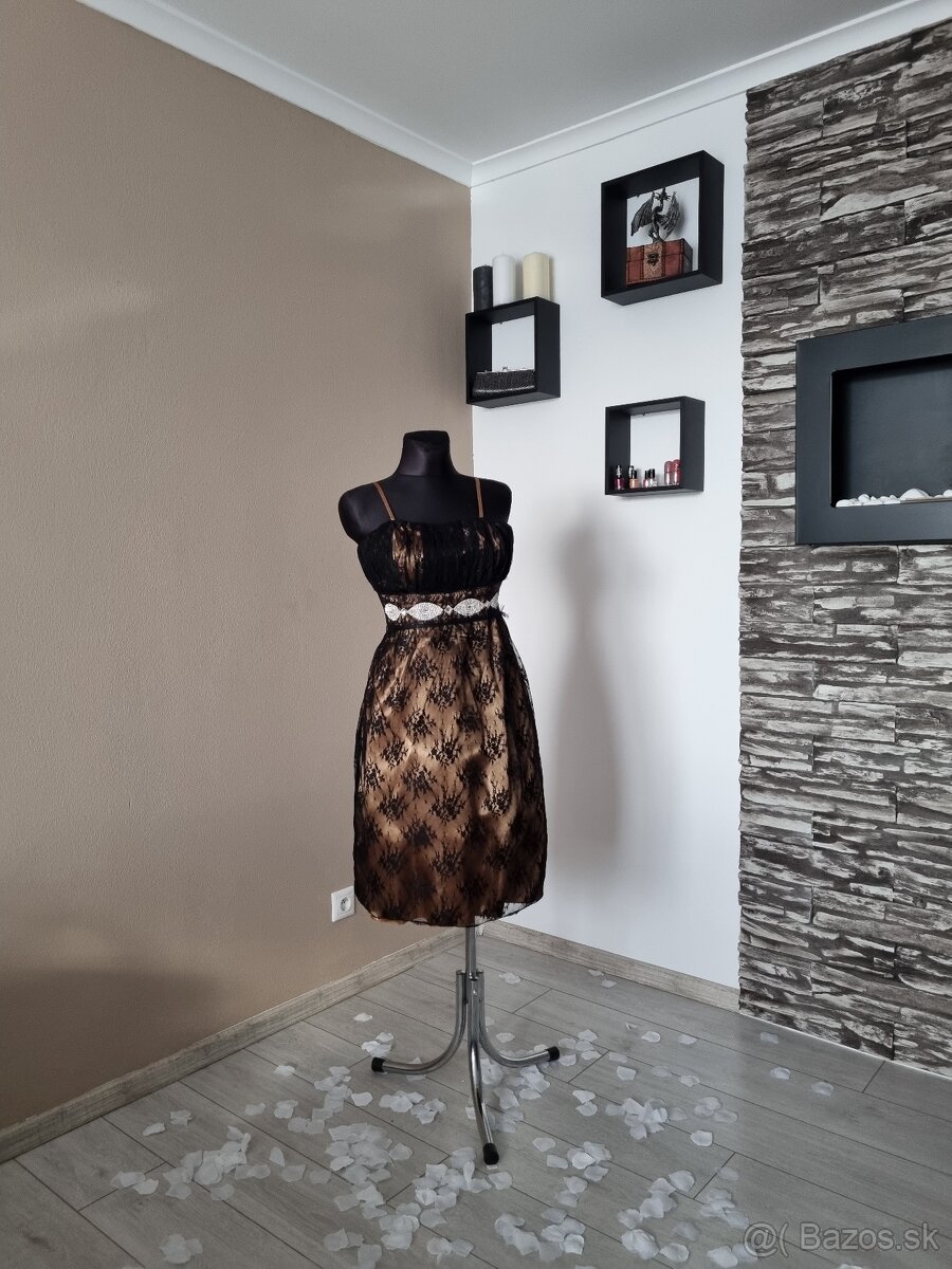 Šaty v čierno-zlatom prevedení zdobené čipkou. Šaty majú v zadnej časti gum. chrbát a preto sa veľmi dobre prispôsobia všetkým typom postáv. K šatám je organzová štóla. Ramienka šiat sú nastaviteľné. Šaty sú krásne a elegantné vhodné na rôzne spoločenské príležitosti. Zapínanie je na boku na zips . Materiál je jemné elastický a preto sa šaty lepšie prispôsobia postave.
