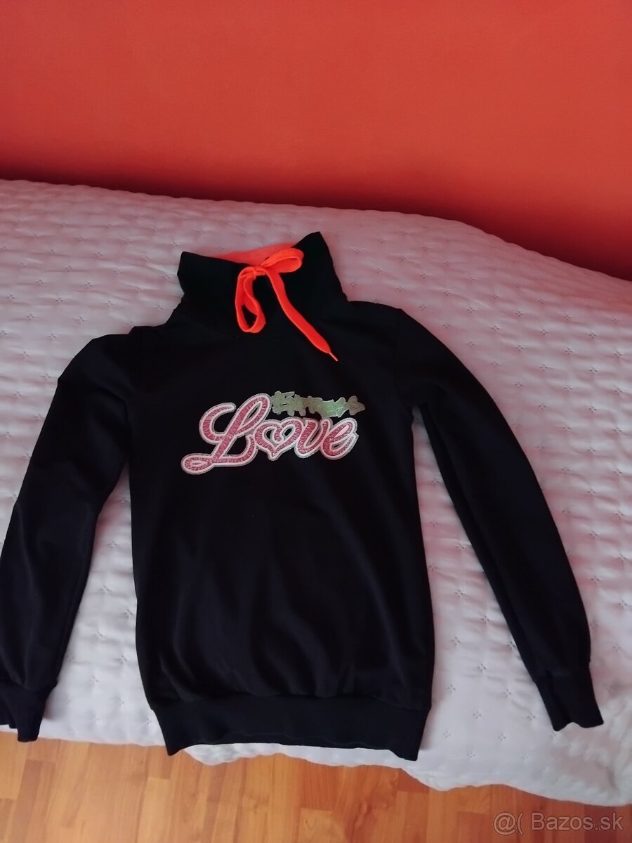 Na predaj tato cierna mikina s napisom, velkost S, cena je 5€ plus postovne.