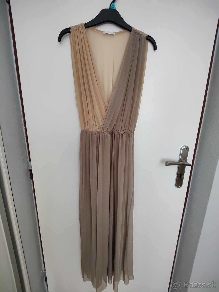 Sieťovinové šaty originál značky Zara, dvojfarebné béžová/sivá, dajú sa nosiť ako plážové šaty či ako vrchné šaty na rôzne veci (šortky, sukňa, legíny rifle ...), v páse guma. Rozmery: dĺžka 130 cm, guma v páse v pokojnom stave 30cm max 60cm. Môže ich kľudne nosiť aj žena/dievča s konfekčnom veľkosťou 38, sú voľného strihu. Skontrolujte si prosím rozmery.