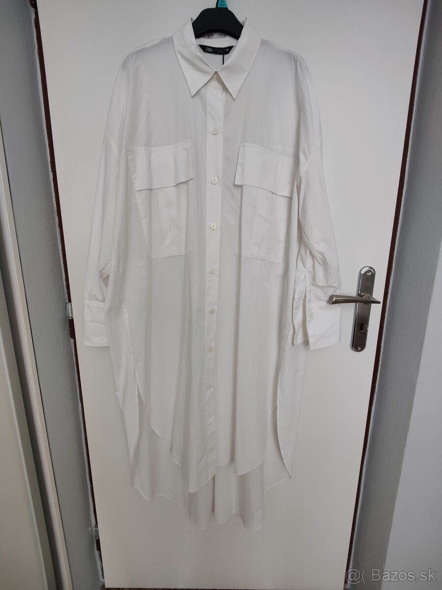 Predám nové biele originál šaty značky Zara, zapínanie gombíky, široké manžety, vpredu vrecká. Bez poškodenia samozrejme. Voľný strih. Rozmery: dĺžka vpredu 120cm vzadu 130cm, šírka cez prsia 68cm, rukáv 52cm. Opakujem ide o voľný oversize strih, dajú sa nosiť ako šaty aj s opaskom aj bez, (opasok k nim nie je/nebol), alebo ako vrchná voľne rozopnutá košeľa. Materiál nie je hrubý.