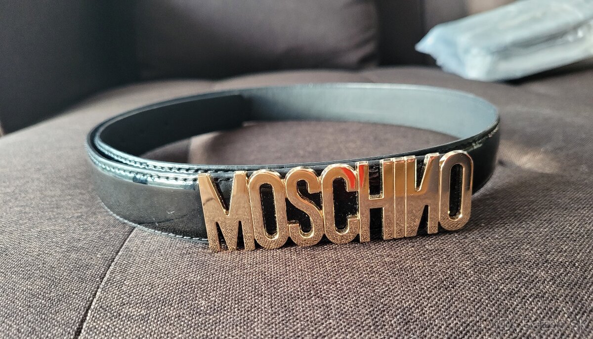 Čierny lesklý dámsky opasok so zlatou prackou Moschino. Celková dĺžka 105 cm. Párkrát nosený, stále prekásny.