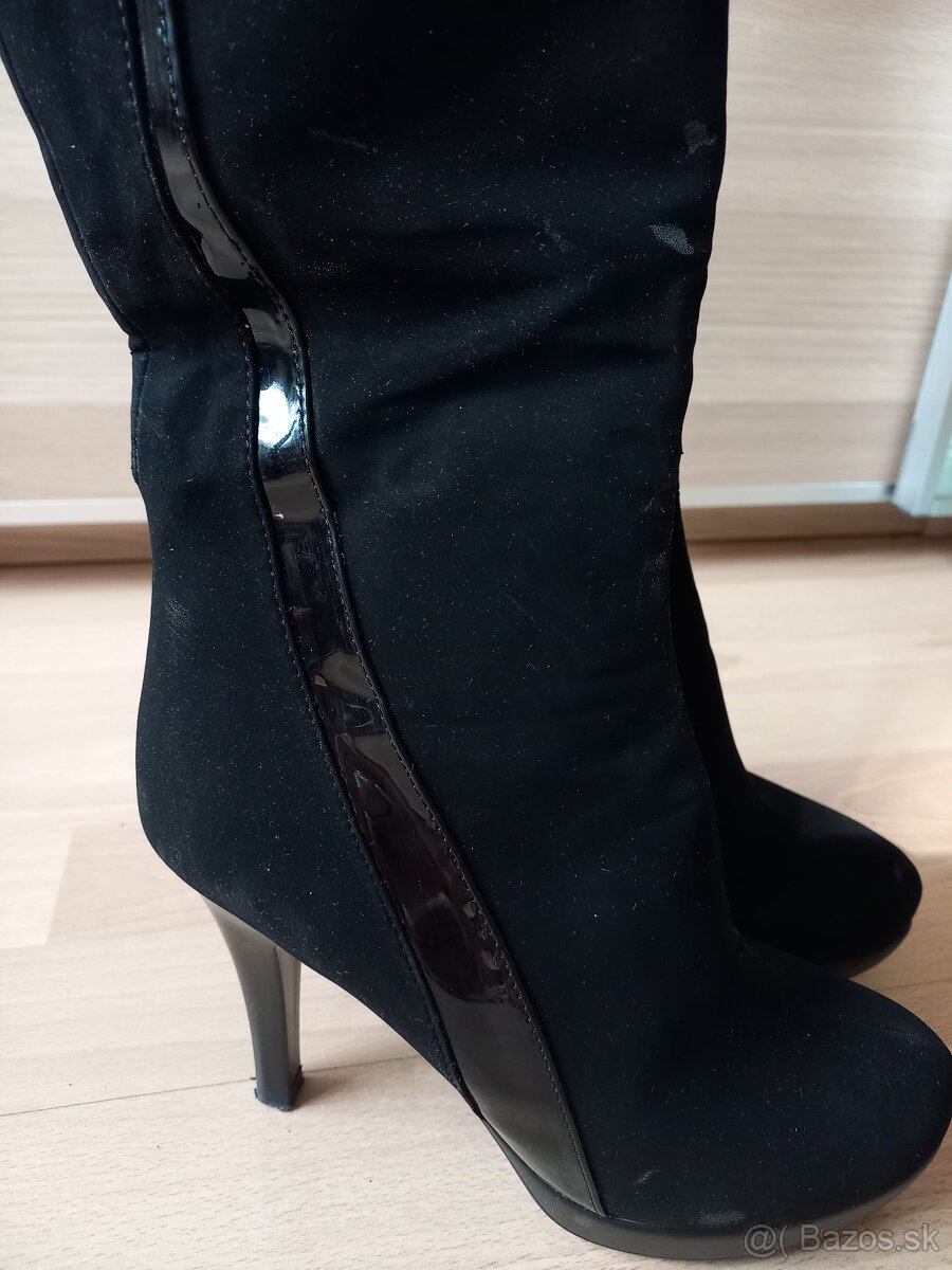 Pár krát obuté čierne semišové čižmy s lesklým pásikom