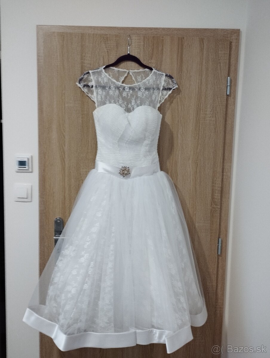 Predám pekné svadobné šaty zo salónu Eva Mária, použité jeden večer, vzadu sú na uväzovanie, sú kratšie, pekne ukážu svadobné topánky, majú spodničku a obal na šaty, veľkosť je 36/S, predám za symbolickú cenu 30eur