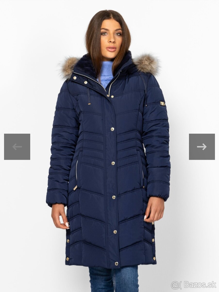 Farba tmavá modrá so zlatými doplnkami,odnímateľná kapucňa, odnímateĺný kožušinkový limec, obojstranný zips, vnútro s kožušinkovou podšivkou.