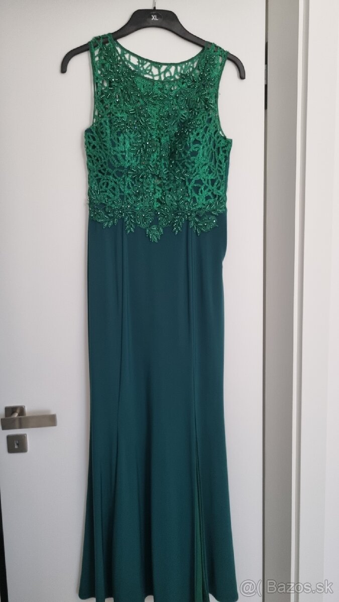 Predám spoločenské šaty, tmavozelenej farby, horný diel vyšivaný, vystužený, spodná sukňa 6 dielna, s rozparkom na lavej nohe, celé podšité, bočný zips, príjemný padavý materiál, velkosť M Neoblečené ani raz. Povodná cena 150 eur