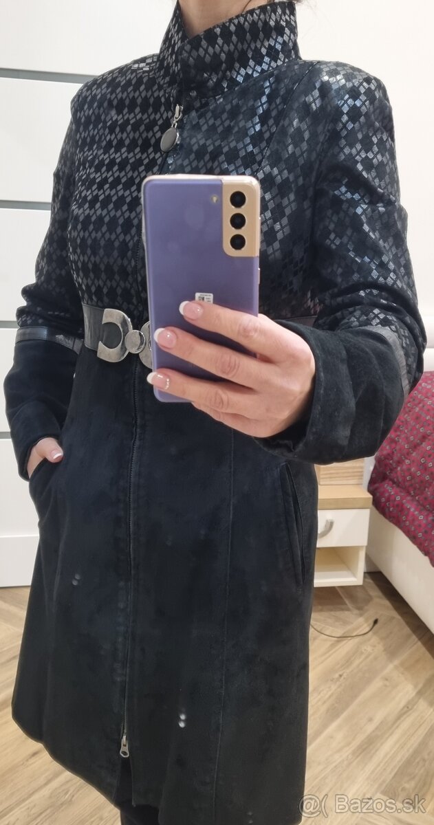 Predám dámsku koženú bundu, čierna farba, strih tvarovaný na postavu, zapínanie na obojsmerný zips, so stojačikom a manžetkami na rukávoch. Vrchná časť vzorovaná, spodná časť brúsená koža. Top stav ako je vidieť aj na golieri - minimálne známky opotrebovania.