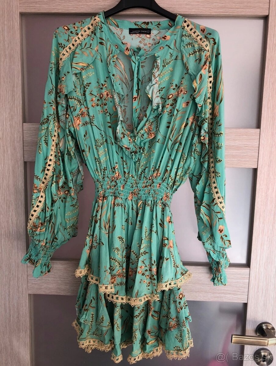 Nenosene, nove bez visacky, maju krasnu zlato zelenu farbu, gumicka v pase, sukna ma 3 volany a mensie volaniky su na rukavoch a vystrihu (len ich treba ozehlit). Dlzka ziat 84cm, velkost M