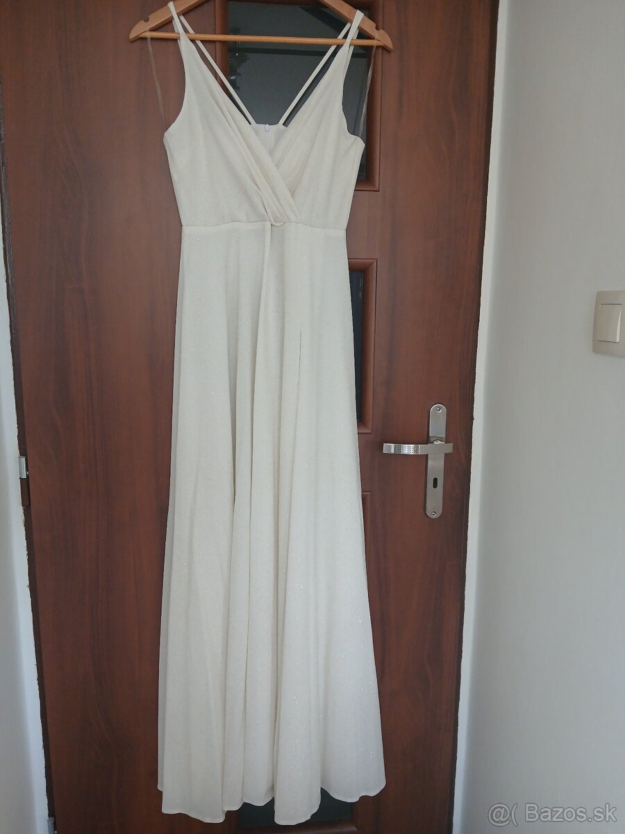 Predám popolnočné svadobné šaty, trblietavé, velk.XS. V skutočnosti sú ešte krajšie ako na fotke kvôli zlatým trblietkam.