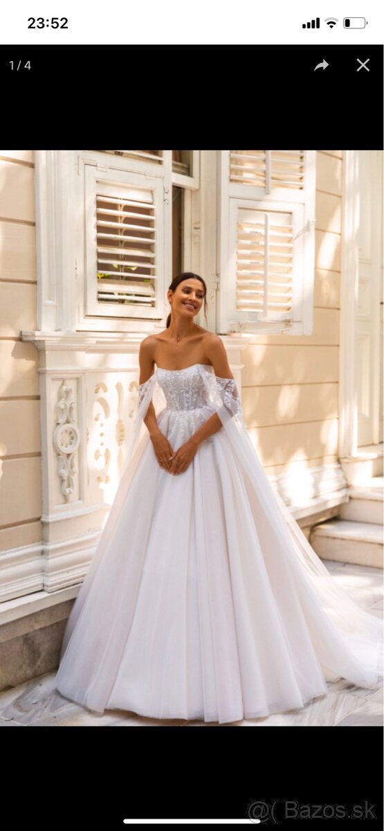 Predám moje svadobné saty značky Lanesta, model Odri, kupované v salóne French Boulevard v Košiciach. Saty sú na snurovacku, takže veľkosť sa dá prispôsobiť (36-40). Vzadu majú vlecku, ktorá sa dá jednoducho vypnúť. K šatám boli prirabane aj rukavniky, ktoré sa dajú odpojiť . Predavam aj s kruhom. Saty sú upravené na výšku 166cm+ 10cm opatok. Pôvodná cena 550€. Saty je možné vyskúšať v Prešove.
