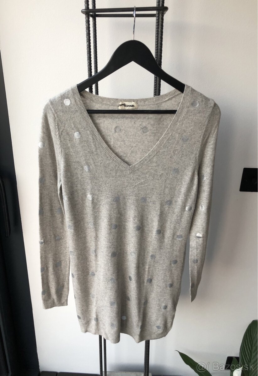 Úplne nový sveter, značka Tezenis, veľkosť S, dĺžka 74cm, farba melírovana sivá so striebornými guličkami, cena 7€ + poštovné