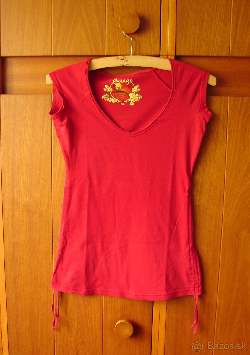 Bavlnené červené tričko so sťahovacími šnúrkami po bokoch trička. Dĺžka: 60 cm, šírka pod pazuchami: 36cm. Veľkosť S, alebo skôr pre dievčatá.