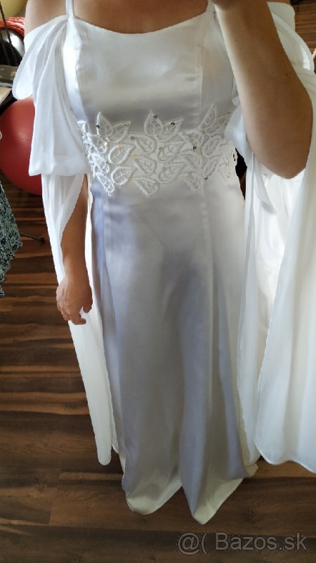 Predám svadobné šaty. Veľmi jednoduché z pevného bieleho lesklého saténu. Tylova spodnicka. Na ramienka so zaujímavými rukávmi, ktoré sa však dajú odparat a zostanú jednoduché ramienkove. Je k nim aj kabelka mini. Pri výške 175cm siahajú po zem aj s miernym opakom. Veľkosť 40 sedí. V prípade záujmu premeriam čo treba.