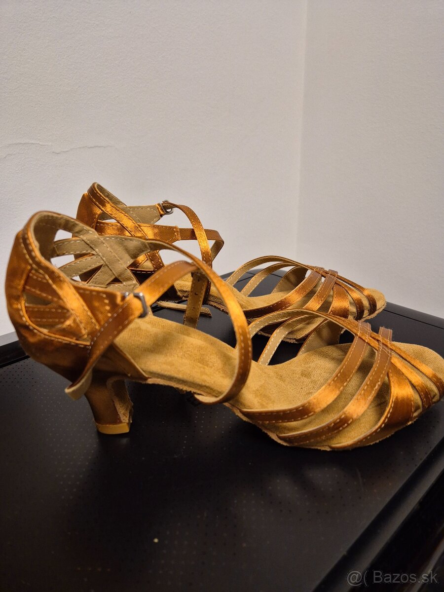 Tanečné topánky latinky 38 nové - [3.12. 2025]Tanečné topánky na latino, krásne, pohodlné, nenosené, nevyužila som. Mäkká stielka, na opätku je chránič, dá sa dať dole. Výška opätku 8,5 cm. Vnút. dĺžka cca 24cm.