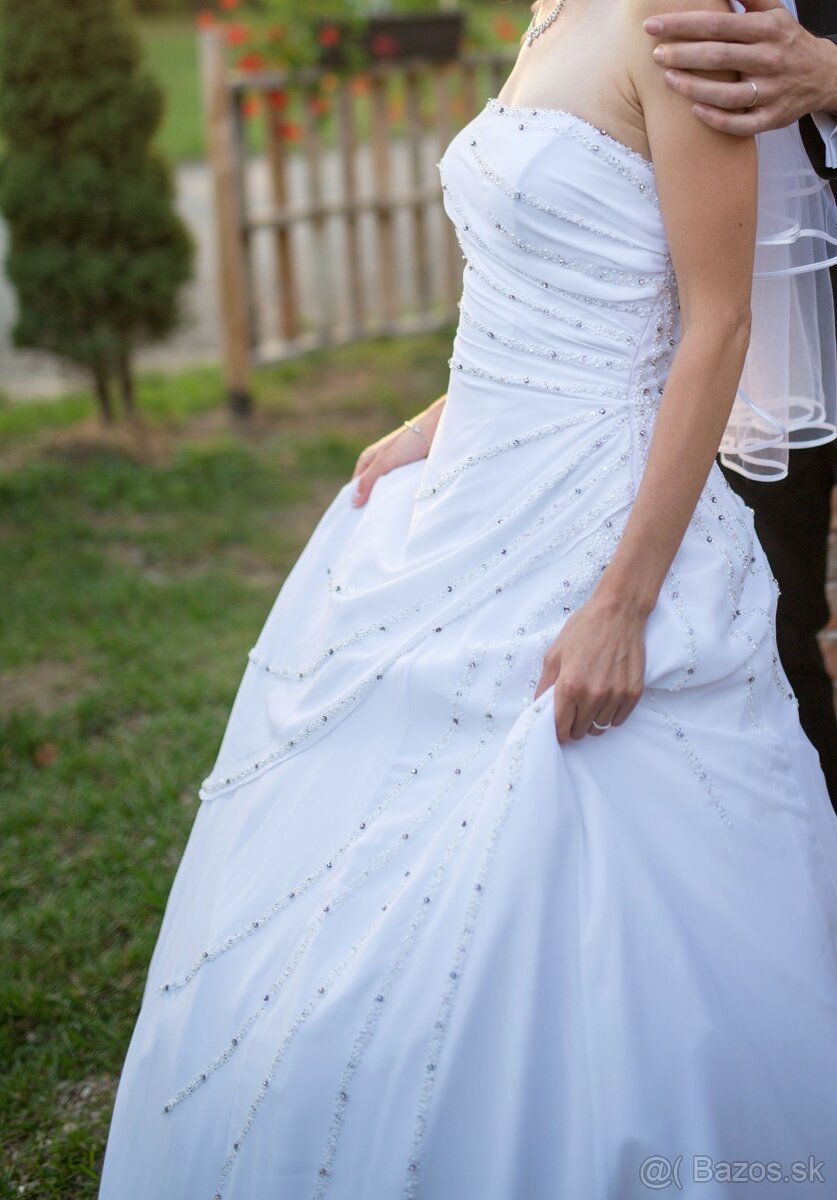 Svadobné šaty so závojom a spodničkou - [1.1. 2026]nosené raz, v skvelom stave, sada spolu so závojom aj spodničkou, veľkosť tak okolo M, pre bližšie info ma neváhajte kontaktovať na 0902380679 alebo matakulkova12@gmail.com