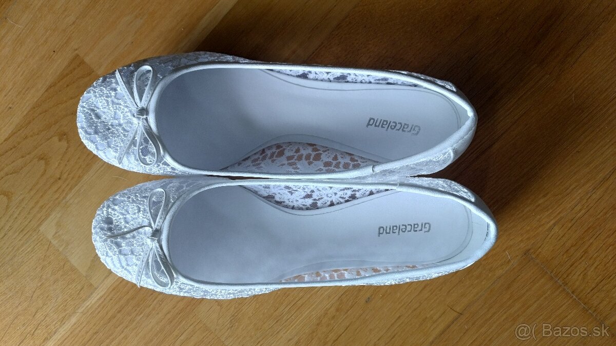 Ponúkam nové biele čipkované balerínky. Kúpené ako náhradná obuv na svadbu, ale neboli využité. Veľkosť: 40