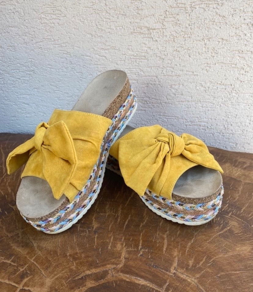 Dámske letné šľapky na platforme s mašľou, žltá až horčicová farba, značka Baťa, veľkosť 39. Úplne nové, použité 2x.
