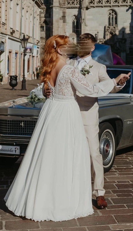 Svadobné šaty francúzskej kolekcie - [1.1. 2026]Svadobné šaty ktoré som mala len raz na sebe, veľkosť šiat je zúžená na veľkosť 46 a dá sa roztiahnuť na veľkosť 50. Zapínanie na zips a gombíky v zadu na chrbte.