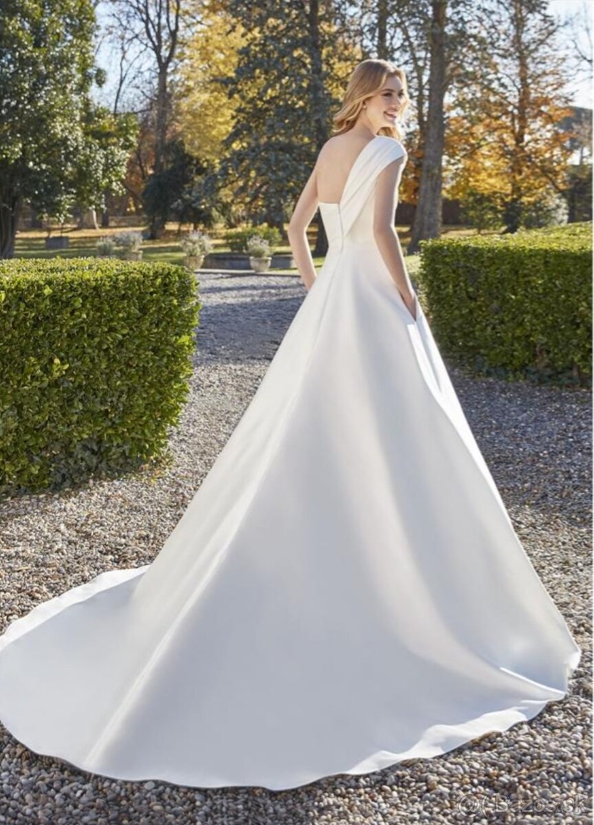Svadobné šaty na jedno rameno s vreckami a zapínaním na zips. Vlečka je vypínacia. Šaty sú bez poškodenia. Materiál je dichesse (hrubý satén)
