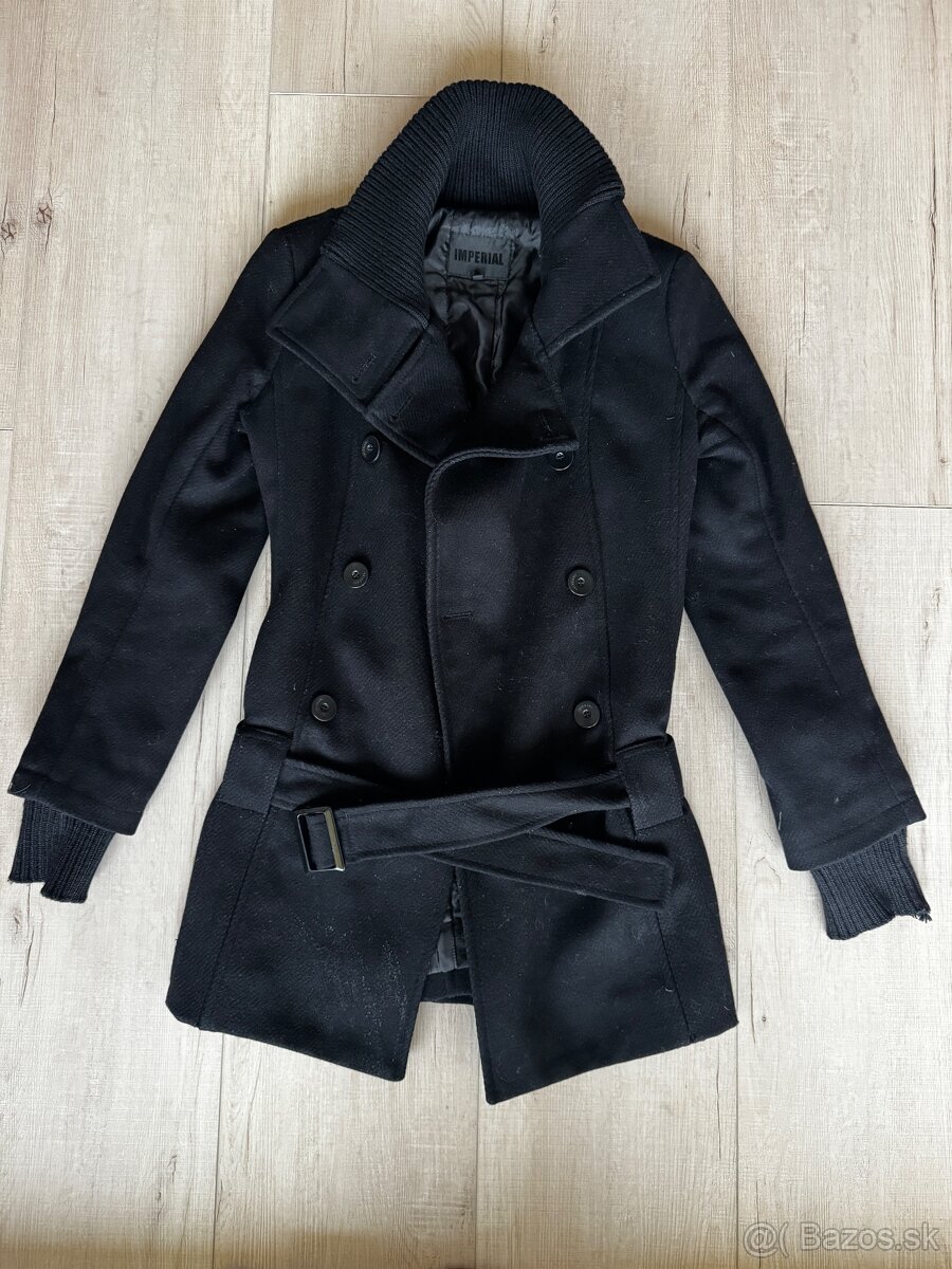 Predám elegantný čierny kabát značky Imperial, veľkosť S, kupovaný v Taliansku. Kabát má nadčasový a elegantný strih, v páse je opasok, ktorý krásne tvaruje postavu. Pôvodná cena bola približne 200 €, teraz ho posúvam ďalej za zlomkovú cenu, ktorá je fixná. Kabát je bez akýchkoľvek poškodení, vo veľmi dobrom stave. Dĺžka kabátu je 71 cm a dĺžka rukávu 62 cm. Vhodný na bežné aj elegantnejšie nosenie.