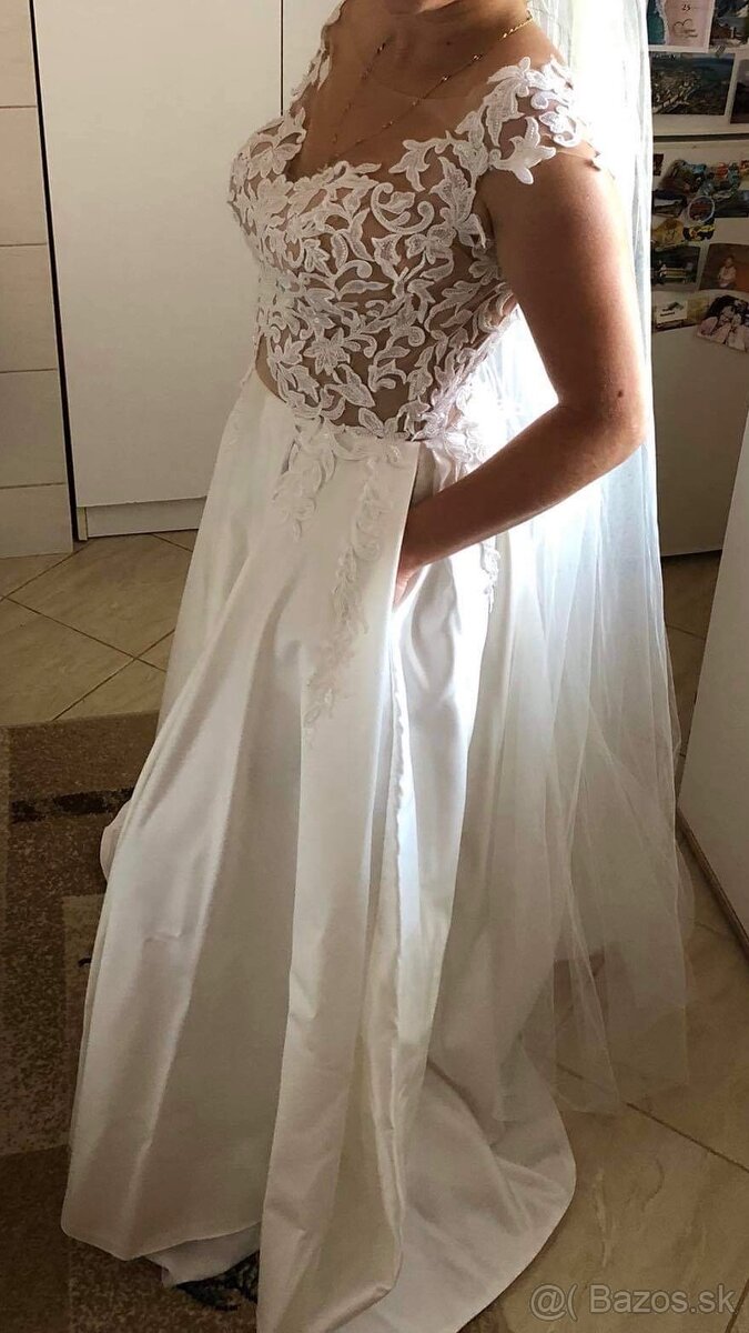 Svadba - TOP - [10.2. 2026]Ponúkam svadobné šaty,veľkosť XS,mám ich skrátené na výšku 164cm, možnosť si ich aj vyskúšať, vyčistené.Mám v ponuke aj ozdobu do vlasov, je v cene so šatami