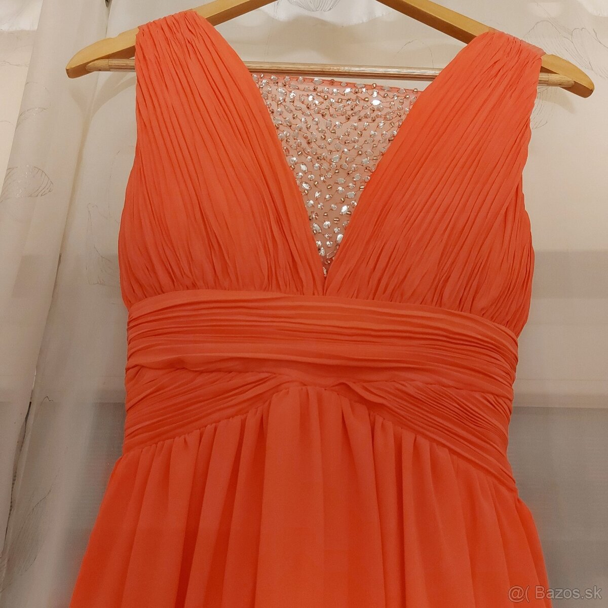 Oblečené len 1 x na plese. Šifónové, sú lososovej farby. Bez poškodenia, vyčistené. Kamienky v dekolte. Sukňa má saténovú podšívku. Pekne tvarované, vystužená podprsenka je samozrejmosťou. Pás v kľude 60 cm, max sa natiahne na cca 66 cm. Ja mám výšku 168 cm, s lodičkami bola dľžka akurát. Ja už nevyužijem - nech slúžia ďalej :-)