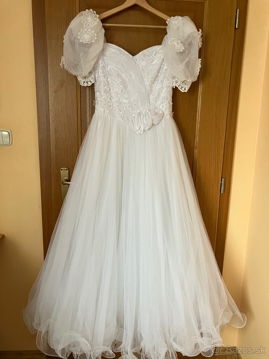 Svadobné šaty - [18.2. 2026]Predám svadobné šaty. Veľkosť M. Dĺžka 146 cm, obvod hrudníka 86 cm, obvod pásu 78 cm (miery sú približné, ťažko sa to meria). Pri výške 169 cm a bez podpätkov siahajú po zem. K šatám pridám aj závoj (pôvodná cena 13,40 €). Lem vlečky je na dvoch miestach poškodený, vidno to len úplne zblízka po nad ...