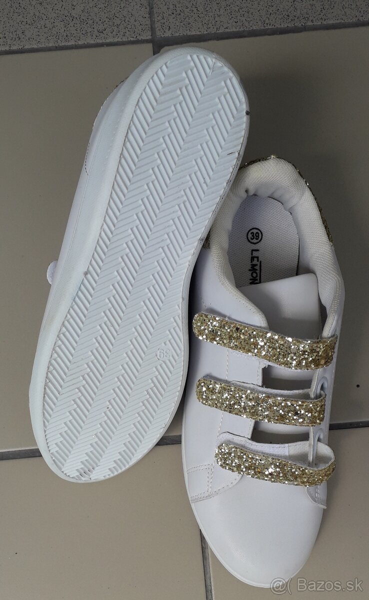 Predám nenosené biele dámske tenisky do zlatou aplikáciou. Veľkosť 39. Cena 8 eur.