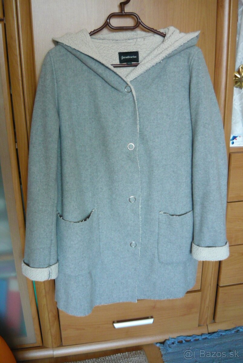 dámsky kabátik s kapucou napevno,farba sivá, vnútro biele. Číslo L. Zapínanie na 4 kovové cvoky. zn. Stradivarius. Mäkký materiál, kabátik nie je ťažký. Cena 12 eur.