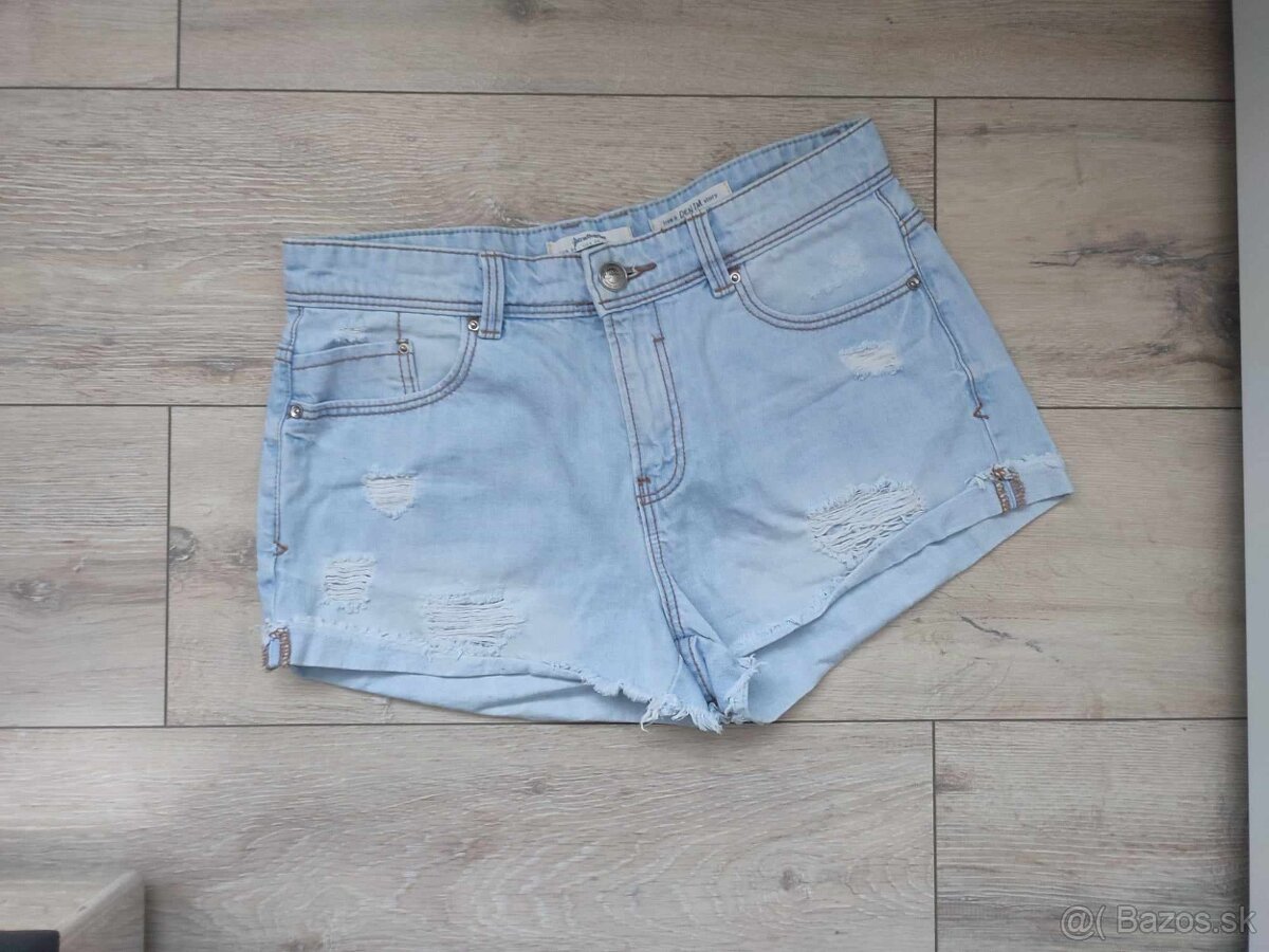 Denimové / rifľové šortky, svetlomodré, roztrhané, veľkosť 36, značka STRADIVARIUS, ako nové, cena 6€.