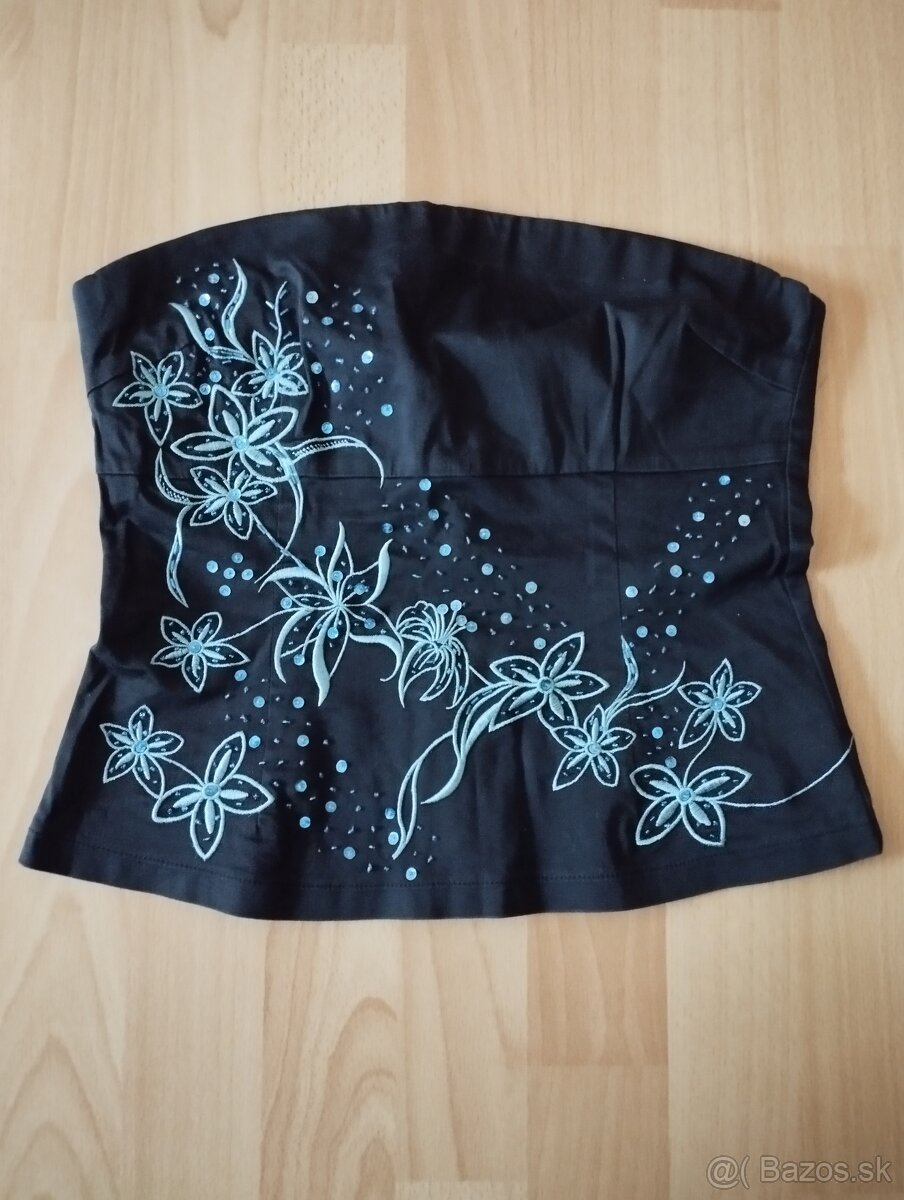 Čierny korzetový top Jane Norman s tyrkysovou výšivkou. Veľkosť UK 12. Dĺžka vpredu 36cm/vzadu 27cm, šírka cez prsia 38x2cm. Natiahne sa trochu. Zapínanie vzadu na zips. Cena 2€ + poštovné. Veci nevymieňam. Kontaktujte ma iba mailom.